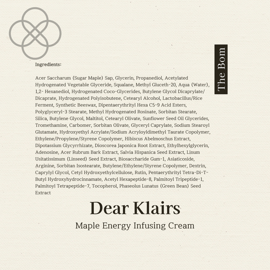 Acer Saccharum (Sugar Maple) Sap, Glycerin, Propanediol, Acetylated Hydrogenated Vegetable Glyceride, Squalane, Methyl Gluceth-20, Aqua (Water), 1,2- Hexanediol, Hydrogenated Coco-Glycerides, Butylene Glycol Dicaprylate/?Dicaprate, Hydrogenated Polyisobutene, Cetearyl Alcohol, Lactobacillus/?Rice Ferment, Synthetic Beeswax, Dipentaerythrityl Hexa C5-9 Acid Esters, Polyglyceryl-3 Stearate, Methyl Hydrogenated Rosinate, Sorbitan Stearate, Silica, Butylene Glycol, Maltitol, Cetearyl Olivate, Sunflower Seed Oil Glycerides, Tromethamine, Carbomer, Sorbitan Olivate, Glyceryl Caprylate, Sodium Stearoyl Glutamate, Hydroxyethyl Acrylate/?Sodium Acryloyldimethyl Taurate Copolymer, Ethylene/?Propylene/?Styrene Copolymer, Hibiscus Abelmoschus Extract, Dipotassium Glycyrrhizate, Dioscorea Japonica Root Extract, Ethylhexylglycerin, Adenosine, Acer Rubrum Bark Extract, Salvia Hispanica Seed Extract, Linum Usitatissimum (Linseed) Seed Extract, Biosaccharide Gum-1, Asiaticoside, Arginine, Sorbitan Isostearate, Butylene/?Ethylene/?Styrene Copolymer, Dextrin, Caprylyl Glycol, Cetyl Hydroxyethylcellulose, Rutin, Pentaerythrityl Tetra-Di-T-Butyl Hydroxyhydrocinnamate, Acetyl Hexapeptide-8, Palmitoyl Tripeptide-1, Palmitoyl Tetrapeptide-7, Tocopherol, Phaseolus Lunatus (Green Bean) Seed Extract